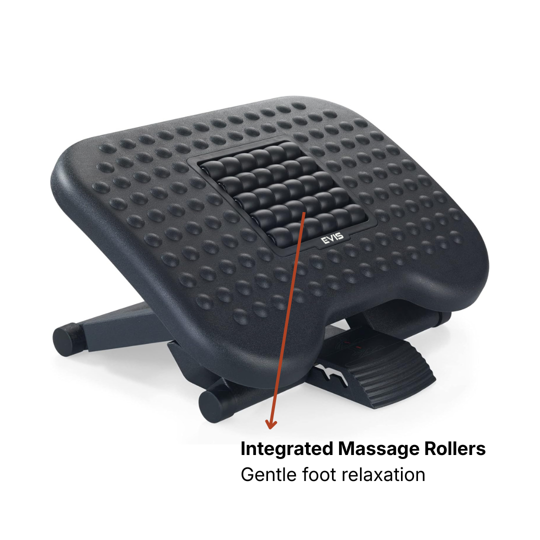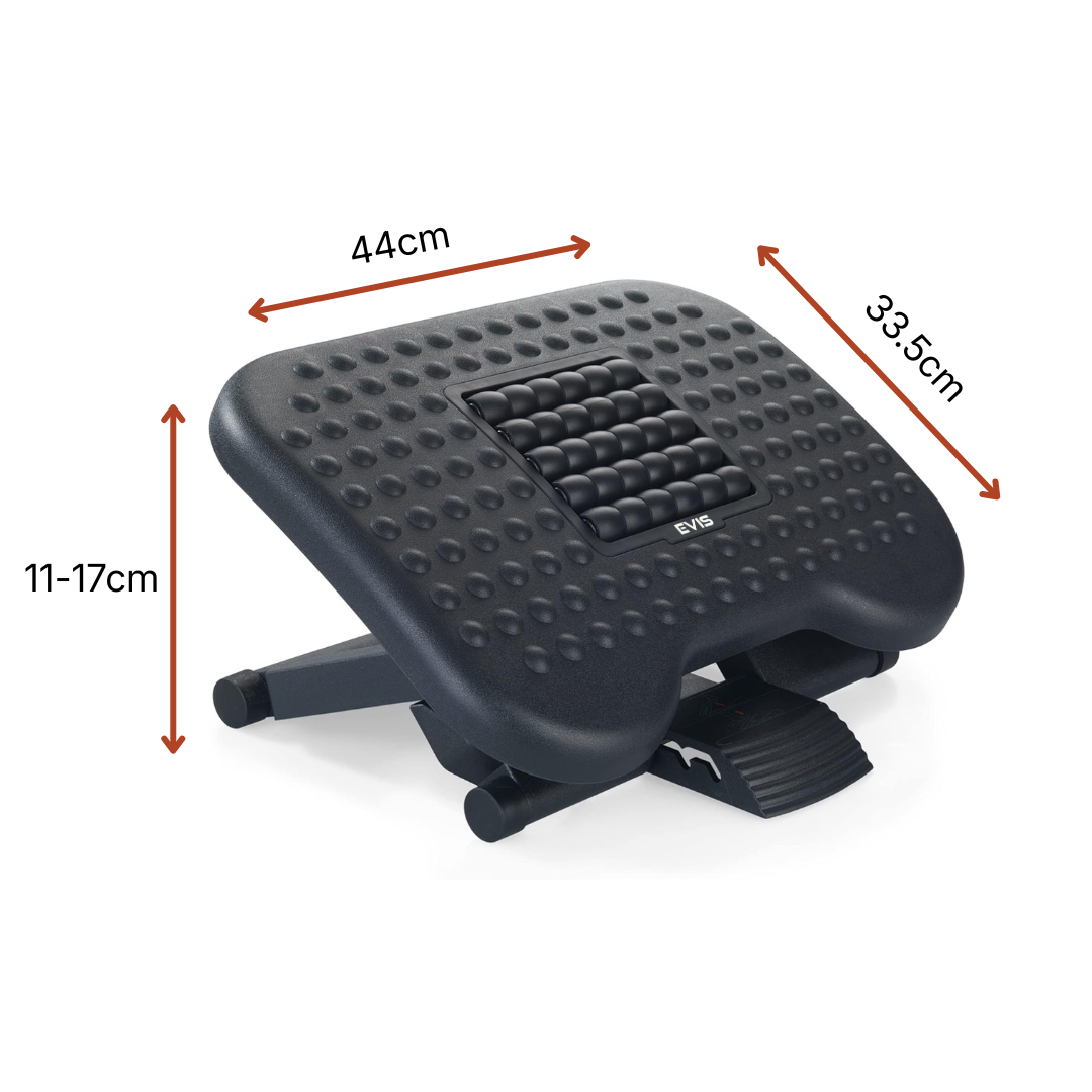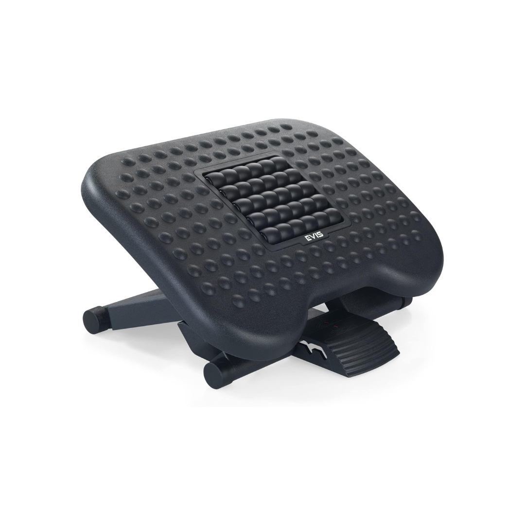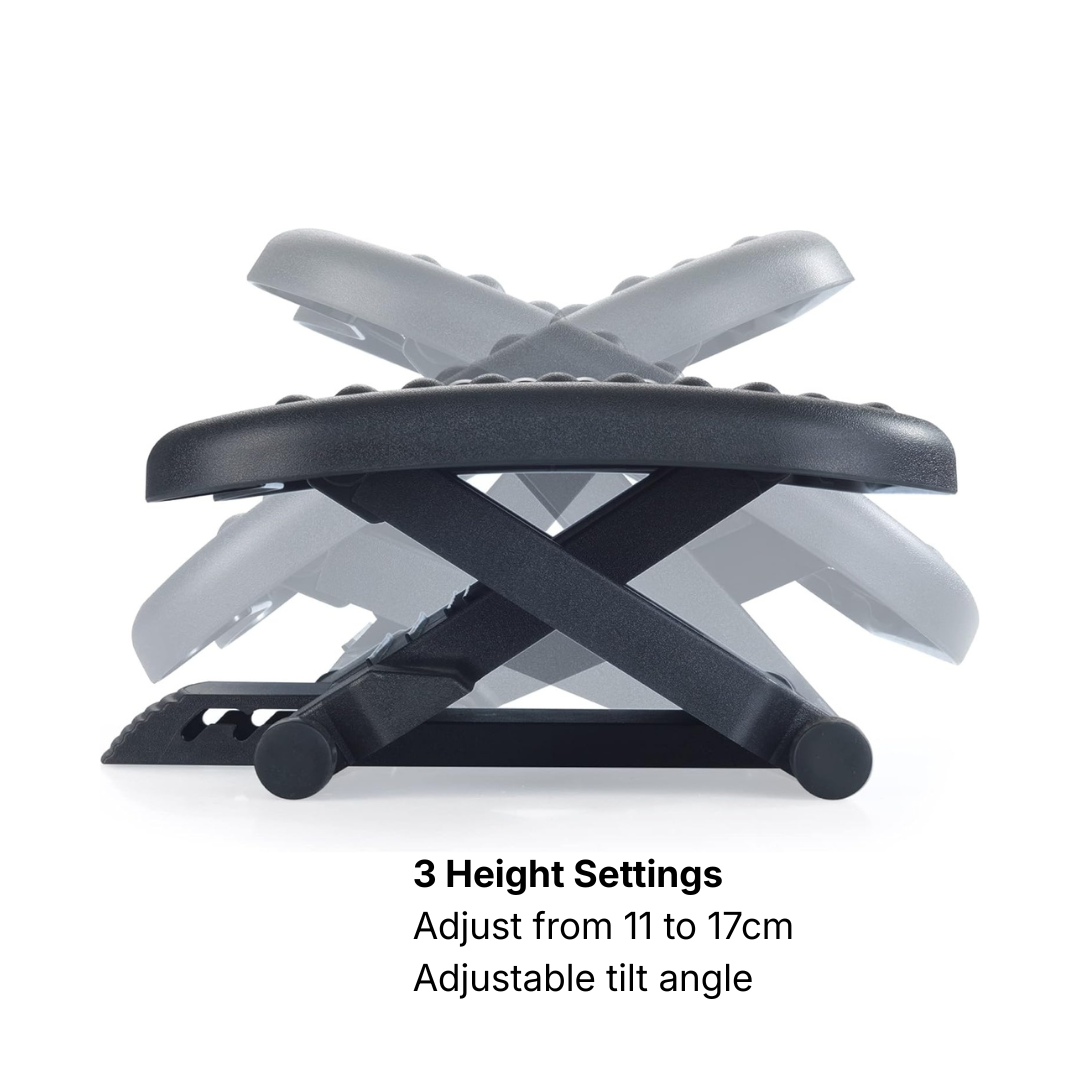 The ergonomic footrest keeps your feet and legs elevated for better posture and less strain. Designed for use under a desk or table, taking up minimal space. The three adjustable tilt settings ensure a great fit for your leg length. Large, non-skid surface prevents your feet from slipping off the foot-rest. Adjustable height lets you stretch your legs for increased circulation and comfort.
